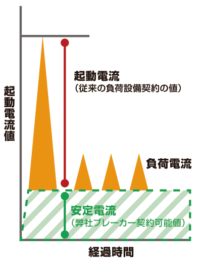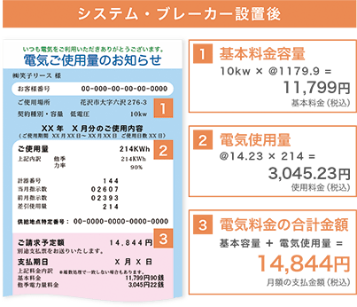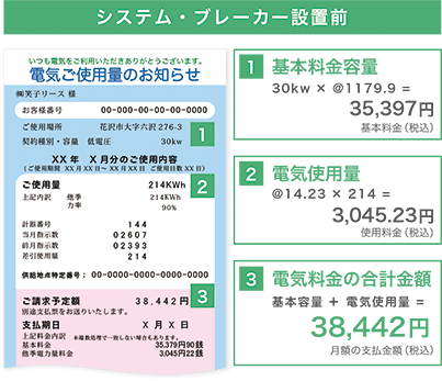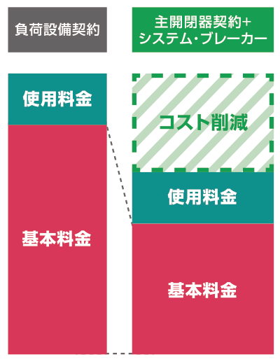 システムブレーカーにより電流値を把握し自動制御にて適切に遮断することで、電力会社との契約容量(主開閉器契約)を小さく変更して基本料金を大幅に下げることができます。