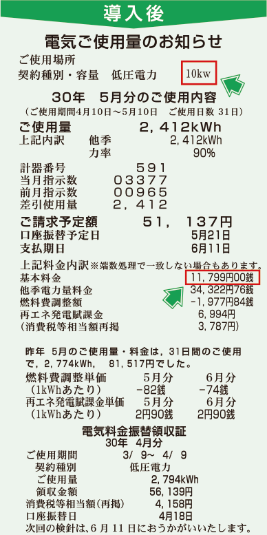 | 東根営業所 | 2017年11月 | 21,238円(18kw) | 10,619円(9kw) | 4,219円 | 50,628円 |